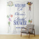 Chuva de Presentes de Noiva Fresh Off the Market Fundo de foto desenhado à mão Este design divertido apresenta ilustrações encantadoras de produtos frescos do mercado, como cenouras, cebolas, alface, rabanetes e flores em buquê, delineados em tons suaves de azul, rosa, laranja e verde.