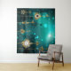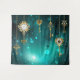 Chaves Douradas e antigas com engrenagens e marcadores penduram em correntes douradas sobre fundo verde luminoso.