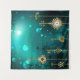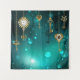 Chaves Douradas e antigas com engrenagens e marcadores penduram em correntes douradas sobre fundo verde luminoso.