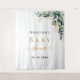 Um fundo branco chic. Decorado com folhas de eucalipto pintadas à mão em verde, raminhos, folhagens e folhas de ouro falso. Personalize e adicione o nome da futura mamãe e uma data. Letras pretas e douradas. Pode ser usado como um banner de boas-vindas para chá de bebê, como decoração de parede para festa ou como fundo para cabine de fotos.