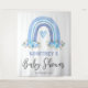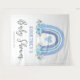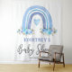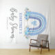 Tapeçaria rústica boêmia para chuva de bebê menino com fundo branco simples, um arco-íris boho em aquarela fofo, flores azuis elegantes e um modelo de boas-vindas moderno que é fácil de personalizar.