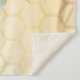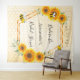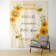 Tapeçaria elegante e divertida para chá de noiva de verão. Fundo amarelo e branco com padrão de favo de mel. Com uma moldura geométrica em dourado falso. Decorado com girassóis rústicos em aquarela amarelos e laranjas e abelhas felizes. Com o texto: Noiva Abelha e o nome da noiva. Personalize e adicione o nome da noiva e uma data. Pode ser usado como decoração de parede para o chá de noiva ou como pano de fundo para fotos.