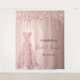 Elegante, clássico, glamoroso e estilo feminino o banner de chuveiro de noiva, fundo para fotos. Um vestido rosa ouro com brilho falso de rosa ouro, visual de gotejamento de tinta. Fundo falso metálico rosa ouro. Com o texto: Chuveiro de noiva escrito com um estilo moderno de letra manuscrita em rosa escuro. Modelo para o nome da noiva e uma data. Pode ser usado como decoração de parede para o chuveiro de noiva ou como fundo para fotos.