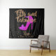 Cortina ou fundo rosa choque e dourado girly sparkly Cinquenta e Fabuloso. Grande sapato de salto alto rosa choque brilhante em fundo preto. O texto dourado diz Cinquenta e Fabuloso e pontos dourados multilaterais. É elegante. Preencha suas informações na parte inferior do fundo.