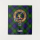 Crachá da crista Clan Gunn rodeado por uma correia e fivela sobre fundo tartano. Texto personalizado.