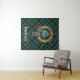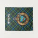 Crachá da crista Clan MacKenzie rodeado por uma correia e fivela sobre fundo tartano. Texto personalizado.