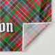 Crachá da crista Clan MacPherson cercado por uma correia e fivela sobre fundo tartano. Custom Text.