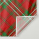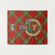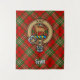 Crachá da crista Clan Scott rodeado por uma correia e fivela sobre fundo vermelho-tartano. Texto personalizado.