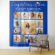 Adicione um toque personalizado elegante à decoração de festas de formatura de faculdade ou segundo grau com um pano de fundo personalizado de colagem de fotos. As fotos e todos os textos neste modelo são simples de personalizar, e as cores são fáceis de mudar com a ferramenta Zazzle design. O design real azul e branco apresenta caligrafia tradicional escrita à mão, tipografia moderna e moderna, e quaisquer fotos favoritas de sua escolha, como mais velho ou imagens da cerimônia de inauguração. Este grande sinal de festa de formatura pode ser pendurado em uma parede para receber convidados para a celebração ou usado como pano de fundo de uma cabine de fotos divertida e na moda. Parabéns ao formando!
