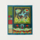 Esta colagem de enforcamento de arte em parede apresenta vários padrões e motivos decorativos chineses e um crachá quadrado ou classificado de mandarina usado no namorando chinês de volta à dinastia Ming (1391-1526) e até à dinastia Qing tardia (1662-1911). Essa colagem de motivos decorativos usados na China foi tirada de livros do século 19 por Albert (Auguste) Racinet (1825-1893), um historiador francês de fantasias, pintor, ilustrador e autor, e arquiteto e designer galês, Owen Jones. Crachás de classificação foram bordados em praças e vestidos por funcionários públicos e militares. Para os funcionários públicos, os crachás eram geralmente aves, como furões, caçadores de paraíso, faisões ouros e prata, patos mandarínicos, gansos selvagens, gruas, pavões, craques, orioles e codornizes. As fileiras militares incluíam leões, tigres, ursos, quilnos (kirin em japonês), rinocerontes, leopardos, panteras e cavalos-marinhos. Na praça de cima também vemos a ave (possivelmente um flycatcher do paraíso) olhando para um disco vermelho-alaranjado que representava o imperador. Era comum ter o animal ou ave nas praças mandarinas olhando para esse ponto focal do disco representando reverência para o imperador. Abaixo da praça de crachá pode-se ver um motivo que representa o oceano, as rochas e montanhas e também as peônias que foram consideradas o rei das flores.