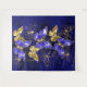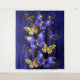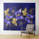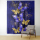 Composição de borboletas luxuosas de safira e joias de ouro em fundo azul texturizado.