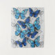 Composição vertical de borboletas de morfo realistas, azuis e brancas sobre fundo texturizado de cinzas. Borboleta azul Morpho.