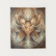 Representação intrincada de abstrato de uma figura nutritiva que abraça duas crianças, composta por linhas fluentes e formas orgânicas. A imagem irradia calor e harmonia através de sua delicada mistura de elementos da terra e do etéreo, com órbitas brilhando suaves simbolizando a vida e o crescimento. Ao redor das figuras centrais estão padrões que lembram a beleza da natureza, enfatizando os temas do amor, da proteção e da interconectividade da vida.