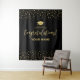 Esta tapeçaria moderna é perfeita para uma festa de formatura com tema de cores preto e dourado. Fundo perfeito para fotos para lembrar seu dia especial. O design apresenta tipografia dourada " Parabéns! " e um chapéu de formatura com fundo de confete. Você pode personalizar o texto.