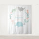 Este tapete de chá de bebê temático debaixo do mar apresenta uma baleia, tubarão tigre, medusa, tartaruga marinha e cavalo-marinho todos nadando em um círculo com algas marinhas e conchas.