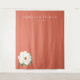 This is a minimalist style image featuring an elegant wedding invitation design with a soft coral background. At the top, the names "Isabella & Patrick" are written in a clean, modern font, followed by their special date, "June 6, 2026." A delicate white peony flower with green leaves adorns the bottom left corner, adding a touch of natural beauty and sophistication. The overall mood is warm and inviting, perfect for setting the tone for a romantic celebration.