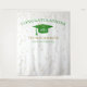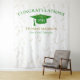 Moderno fundo de celebração de formatura para oportunidades de fotos! Brilho no topo e na parte inferior, serpentinas douradas a partir da borda superior, chapéu de formatura e letras em verde, modelo de nome em dourado. Turma de em letras cursivas douradas brilhantes com modelo de ano em branco. Adicione o ano, nome e nome da escola.