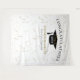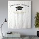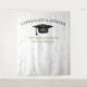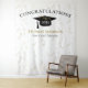 Pano de fundo de celebração de formatura moderna para oportunidades de fotos! Brilho no topo e na parte inferior, serpentinas douradas a partir da borda superior, chapéu de formatura e letras em preto, modelo de nome em dourado. Turma de em letras de script glitter dourado com modelo de ano em branco. Adicione ano, nome e nome da escola.