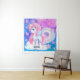Um unicórnio bebê de cor aquosa está parado numa nuvem, com arco-íris e estrelas de fundo colorido.