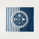 Design náutica com símbolos náuticos (âncora, barco à vela, roda à vela, bússola) decoração em fundo listrado branco e azul marinho.