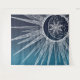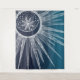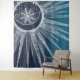 Um design de gradiente mágico, branco, dourado e da lua mandala azul e lacrimogêneo, com flores e folhas, estrelas, pontos, diamante, círculos, triângulos, formas de chevron, escala de sereia, padrão geométrico, feito com uma cor branca vibrante e brilhante, com uma lua brilhante palco crescente, uma estrela da flor da mandala, em tom azul marinho, e fundo de gradiente azul claro. Este lindo, místico, tema do universo, sol fofo, henna, trabalho de arte do estilo mandala, impressão de imagem original.
