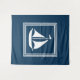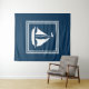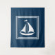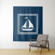 Design com temas náuticos, com decoração de embarcações à vela em quadrados distribuídos em fundo azul