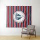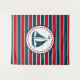 Design náutica com decoração de embarcações à vela em forma redonda com estrelas sobre fundo listrado vermelho, azul e branco
