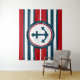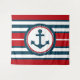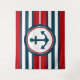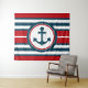 Design náutico com decoração em forma redonda com âncora sobre fundo listrado vermelho, azul e branco
