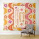 Esta é uma tapeçaria personalizada de festa de despedida retro floral groovy com flores retro muito fofas em ondas abstratas groovy em rosa, laranja, amarelo e roxo. você pode alterar os detalhes e torná-la sua usando o modelo personalizar.