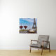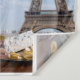 Dois copos de vinho tinto com salgadinhos com vista a Paris e à torre Eiffel. Vidro de vinho tinto com diferentes aperitivos - prato com presunto, fatiado, queijo azul. Casal, celebração romântica. Café com vista
