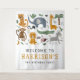A Tapeçaria de Boas-vindas com Animais de Safari para o 2º Aniversário de Crianças Fofas apresenta girafa, elefante, leão, zebra, leopardo, macaco, cobra, crocodilo, animais selvagens fofos e coloridos com o texto em tipografia moderna preta e mostarda. Perfeito para celebrações de aniversário de dois anos de meninos ou meninas. Criado por Evco Studio. Para itens coordenados, visite www.zazzle.com/store/evcostudio