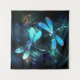 Duas libélulas transparentes, luminosas, turquesas, desenhadas artisticamente sobre fundo noturno, com algas e vagalumes luminescentes do lago. Dragonfly brilhante.