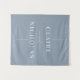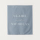 Modern, elegant wedding tapestry for a welcome sign features a minimalist dusty blue and white design with modern lines. Personalize this fabric sign with your wedding details with the easy to edit template featuring an elegant script font and classy serif font.