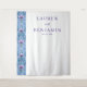 This elegant wedding backdrop features a split design with a vertical floral pattern on the left, showcasing stylized purple flowers and swirling blue leaves against a soft blue background. The right side offers a clean white space with customizable text in an elegant serif font, perfect for personalizing with names and dates. The classic and sophisticated style combines romantic florals with crisp typography, creating a balanced aesthetic ideal for formal celebrations. Its mood of elegance and anticipation makes it a beautiful addition to any wedding setting.