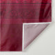 Tapeçaria com fundo vermelho decorado com espirais elegantes e desenhos ornamentais ao longo das bordas.