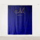 Elegante fundo de monograma floral azul naval dourado para recepção de casamento com cabine de fotos. Bela decoração personalizada. Nomes e data estão no topo. Padrão metálico chic, moderno, trendy, clássico, estiloso e suculento. Para alterar o texto, clique em editar design. Direitos autorais da imagem Marg Seregelyi Photography.