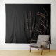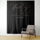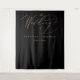 Esta elegante tapeçaria de casamento personalizada é o pano de fundo perfeito para as fotos da recepção do seu casamento. O design de tipografia simples apresenta caligrafia moderna manuscrita dourada rosa falsa em um fundo preto que lê "o Casamento de" com seus nomes e data para personalizar. Criado por Susan Coffey.