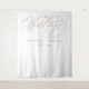 Esta elegante tapeçaria de casamento personalizada faz o pano de fundo perfeito para as fotos da recepção do seu casamento. O design de tipografia simples apresenta caligrafia moderna manuscrita rosa dourada falsa em um fundo branco que diz "o Casamento de" com seus nomes e data para personalizar. Desenhado por Susan Coffey.