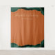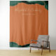 Esta elegante tapeçaria fotográfica de casamento mostra uma esmeralda verde e uma borda de ouro no topo e no fundo de uma laranja queimada ou fundo de ferrugem. Personalize-o com os nomes da noiva e do noivo em letra dourada, seguida da data.