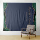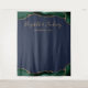 Esta elegante tapeçaria fotográfica de casamento mostra uma esmeralda verde e uma borda de ouro em cima e baixo sobre um fundo azul marinho. Personalize-o com os nomes da noiva e do noivo em letra dourada, seguida da data.