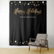 Monte uma cabine de foto selfie que duplique como um sinal de boas-vindas na sua próxima Festa de Natal Corporativa. Impressão dourada com letra "Feliz Natal" para combinar com os convites desta coleção. Pontos de confete branco dourado em um fundo preto elegante.