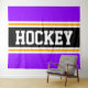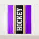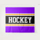 Este esportivo, design atlético, apresenta dentro de texto ousado HOCKEY com uma faixa preta destacada com faixas duplas de corrida branca e amarela contra faixas externas roxas brilhantes. O texto neste design pode ser personalizado.