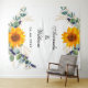 Fundo branco chic. Decorado com folhas de eucalipto coloridas à aguarela verde, raminhos, folhagens, girassóis e folhas de ouro falso. Personalize e adicione os nomes da noiva e do noivo e a data. Pode ser usado como um banner de boas-vindas, como decoração de parede de festa ou como pano de fundo para cabine de fotos.
