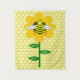 Esta incrível tapeçaria apresenta uma imagem gráfica de uma linda abelha melífera amarela com listras pretas, olhos, antenas e pernas. Ela tem lindas asas azuis e brancas. A abelha está sentada no meio de um girassol amarelo dourado. A flor tem um caule verde e três folhas. A mensagem "feliz dia da abelha" aparece espalhada pelas três folhas. O fundo é composto por um padrão de favo de mel amarelo.