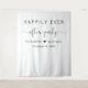 Elegante sinal de boas-vindas da recepção de casamento branca e tapeçaria com fotos apresentando "Felizmente Nunca Depois da Festa" em uma simples tipografia e um roteiro de na moda, seus primeiros nomes se uniram por um coração e sua data de recepção.