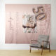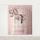 Um tapete para uma festa de 50 anos glamourosa e feminina. Um fundo gradiente rosa dourado rosa com pingos de brilho falso colorido em rosa dourado elegante, com efeito de tinta pingando. Personalize e adicione sua própria foto de alta qualidade da aniversariante. O texto: O nome é escrito em rosa dourado escuro com um estilo de letra manuscrita moderna com floreios. O número 50 é escrito com uma fonte de balão da moda. Para manter os floreios, apenas exclua o nome da amostra, deixando os espaços ou emojis antes e depois do nome. Pode ser usado como uma faixa de boas-vindas, decoração de parede para a festa ou como um fundo para cabine de fotos.