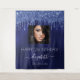 Uma tapeçaria para uma festa de 21 anos (ou qualquer idade) feminina e glamorosa. Um fundo azul-marinho com pingos de brilho azul falso. A cor do fundo azul é irregular. Personalize e adicione sua própria foto de alta qualidade da aniversariante. O texto: O nome é escrito com uma fonte moderna de letra manuscrita com floreios. Para manter os floreios, basta excluir o nome da amostra e deixar os espaços ou emojis antes e depois do nome. Modelos para um nome, idade 21 e uma data. Pode ser usado como decoração de parede para a festa ou como pano de fundo para cabine de fotos.