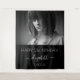 Uma tapeçaria para uma festa de 21 anos (ou qualquer idade) feminina e glamorosa. Um fundo preto moderno e elegante. Personalize e adicione sua própria foto de alta qualidade da aniversariante. O texto: O nome é branco com um estilo de letra manuscrita moderna com floreios. Para manter os floreios, apenas exclua o nome da amostra, deixando os espaços ou emojis na frente e após o nome. Modelos para um nome, idade 21 e uma data. Pode ser usado como decoração de parede para a festa ou como fundo para cabine de fotos.