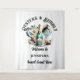 Belas conchas de ostra abertas iridescentes têm uma garrafa de champanhe à frente delas, colocadas contra um fundo branco que tem modelos de texto preto editáveis para a sua redação personalizada. Este enfeite de parede é ideal para uma festa ou evento com tema de praia, náutico, marinho, sob o mar ou frutos do mar.