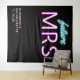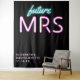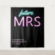 Toalha de mesa preta personalizada moderna e descolada de "futura Sra" para sua festa de despedida de solteira, com "futura" e "SRA" escritos em azul turquesa e rosa choque com efeito de luzes de neon. Você pode personalizar com seu nome e data da festa. O canto inferior é deixado em branco para uma área para seus convidados tirarem fotos.